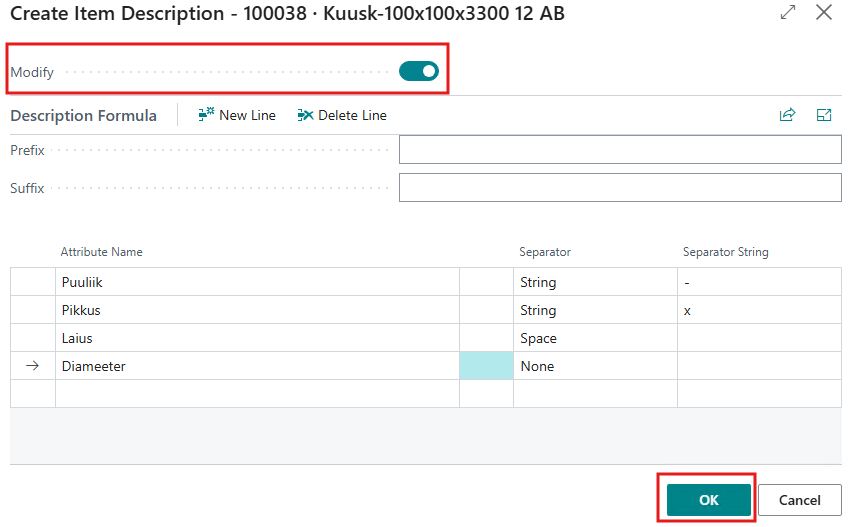 If necessary, make changes to the formula by enabling the Modify marker. To add or remove attribute names from the description, use the Add line and Delete line options as needed. Confirm the action by selecting OK.