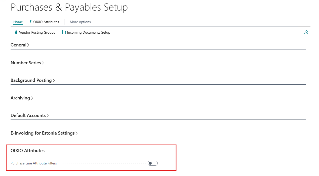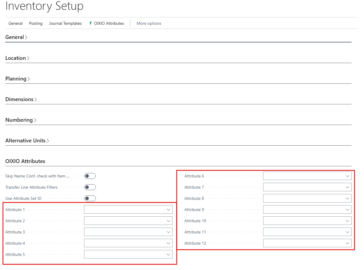 In the Attributes section of the Inventory setup page, specify the item attributes you want to see as filters on various base document lines. Up to 12 attributes can be used.