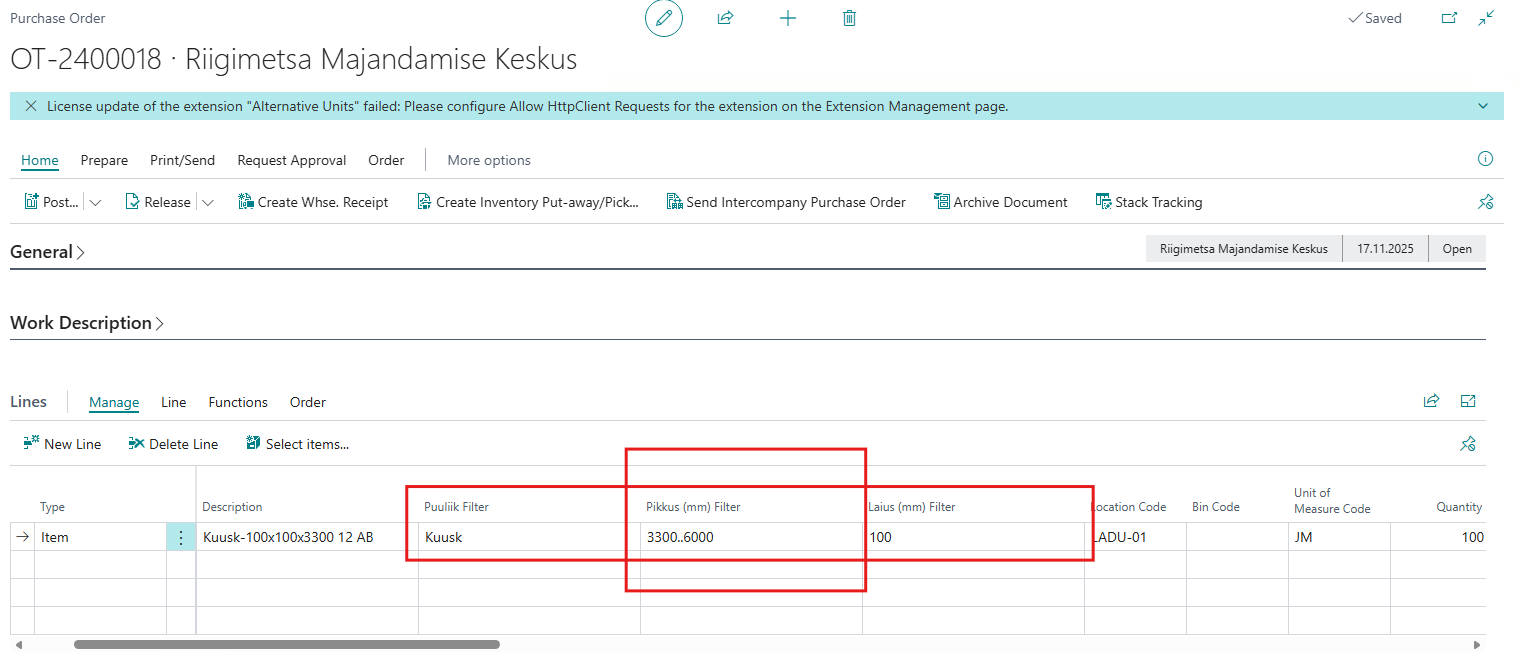 Below is an example of using attribute filters on a purchase order. Each filter can be defined with one or multiple values. For multiple selections, use the range and multiple value filter options in Business Central, such as specifying item length as a range.