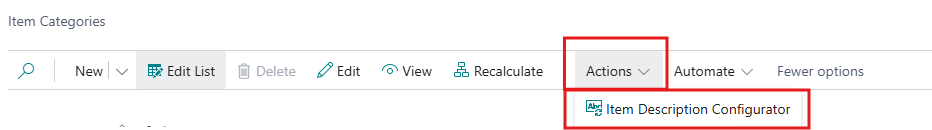Preset item name configurator formulas can be created for each item category. To do this, search for Item Categories. In the opened window, select the item category you want to describe the formula for. Then, choose Item Description Configurator from the Actions menu.