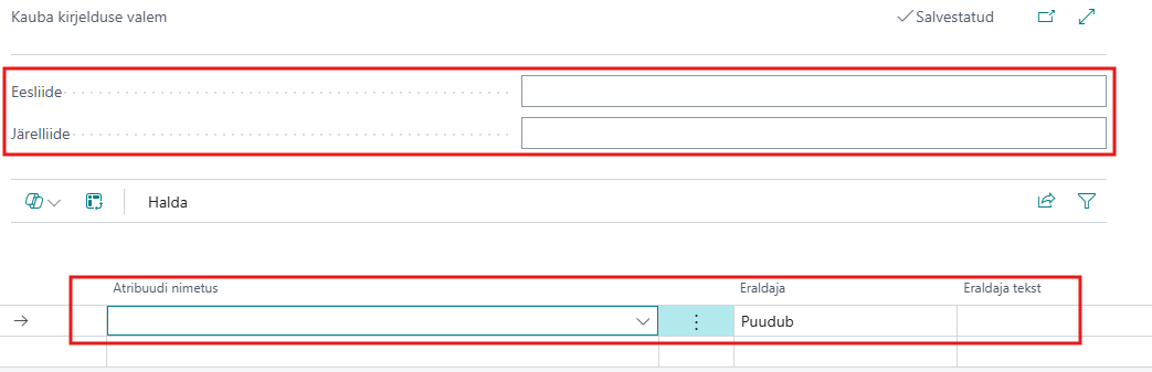 • Atribuudi nimetus- kauba atribuudi nimetus, mida kauba kirjelduses kasutada;
