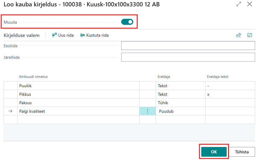 Vajadusel tee valemis muudatused, selleks lülita sisse Muuda marker. Atribuudi nimetuste lisamiseks või eemaldamiseks kirjeldusest kasuta vastavalt Uus rida ja Kustuta rida valikuid. Kinnita toiming valikuga OK.