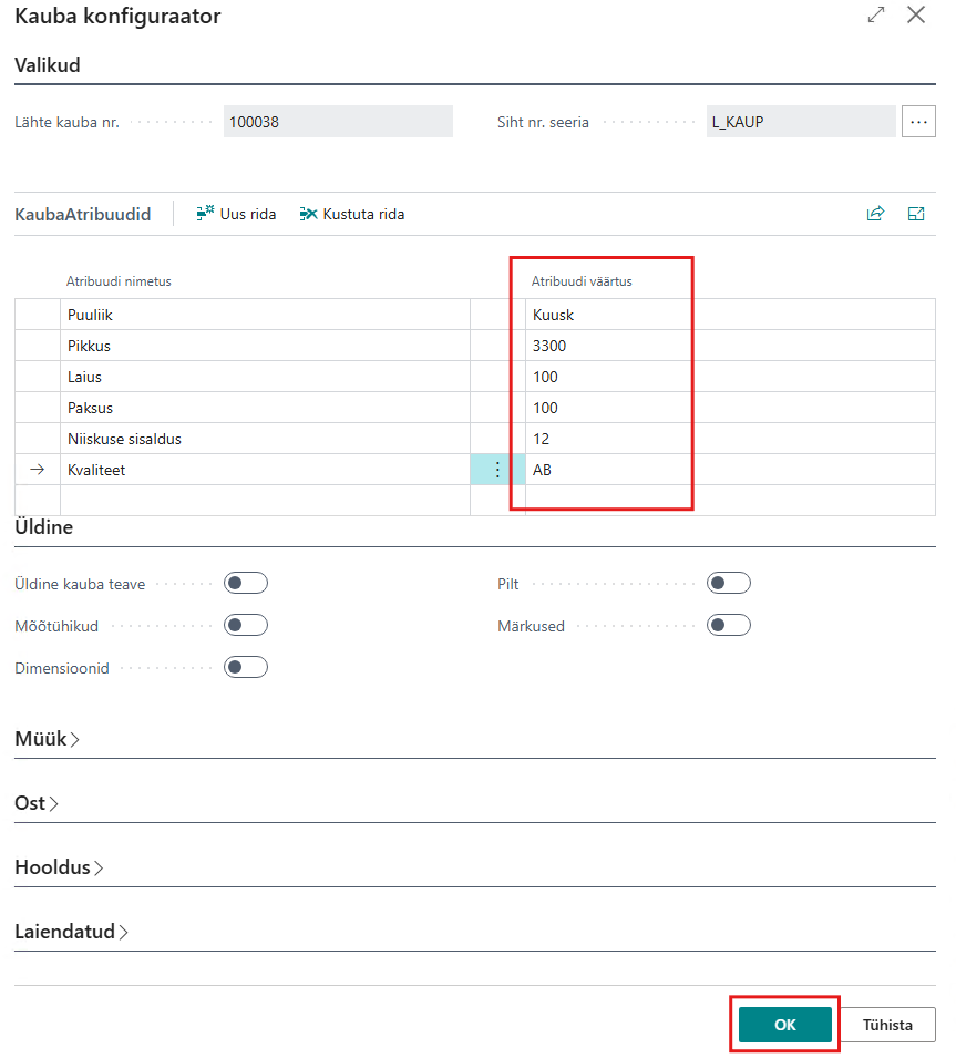 Märgi kauba konfiguraatori alammenüüdes sobivad markerid, et kopeeritava kauba pealt kaasata muud seotud infot. Näiteks, märkides üldine menüüs dimensioonide markeri kaasatakse aluseks võetud kauba dimensioonid loodavale kaubale. Kinnita uute kaubakoodide genereerimise soov OK.