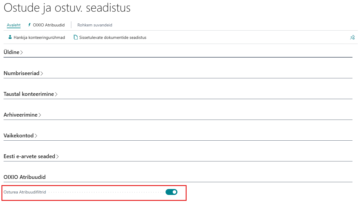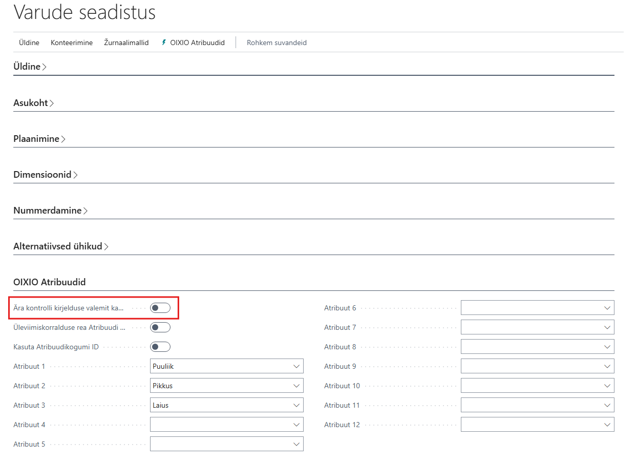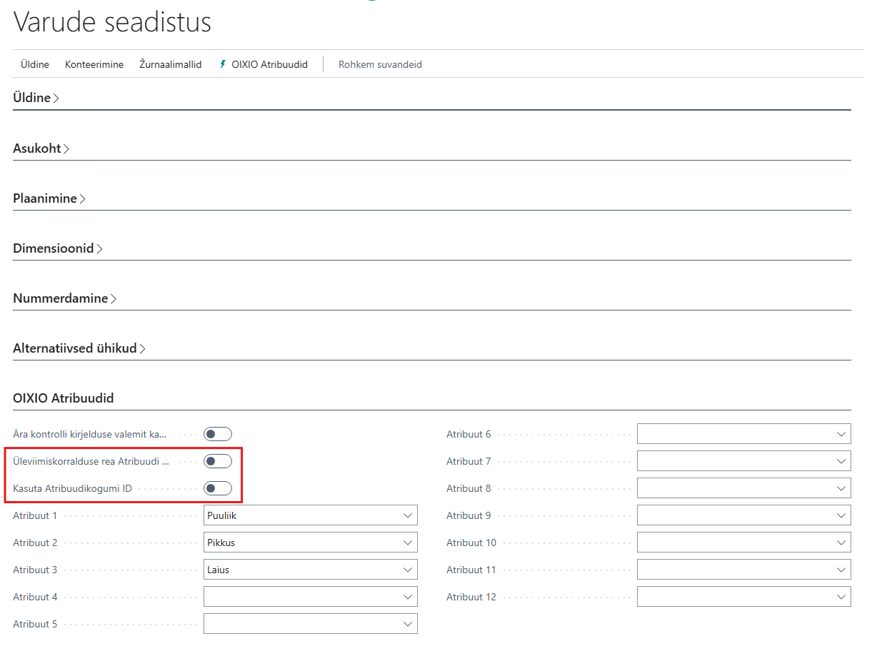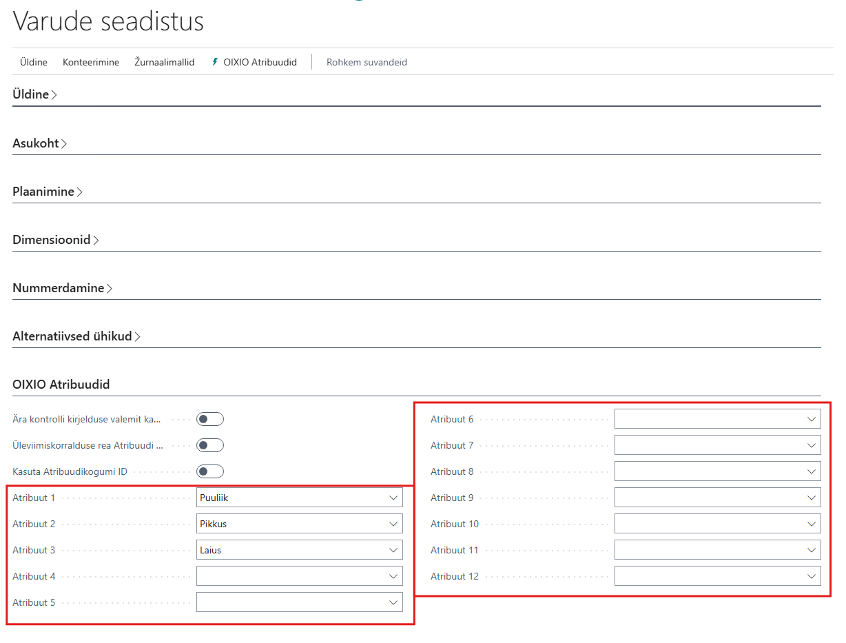 Varude seadistus lehe OIXIO Atribuudid alamjaotuses määra kaubaatribuudid, mida soovid filtritena erinevatel alusdokumendi ridadel näha. Kasutusse saab võtta kuni 12 atribuuti.