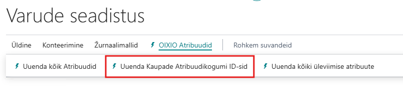 Esmasel seadistamisel tuleb antud tabeli loomiseks Uuendada Kaupade Atribuudikogumi ID-sid. Seda saad teha Varude seadistuse- OIXIO Atribuudid alamvalikust.