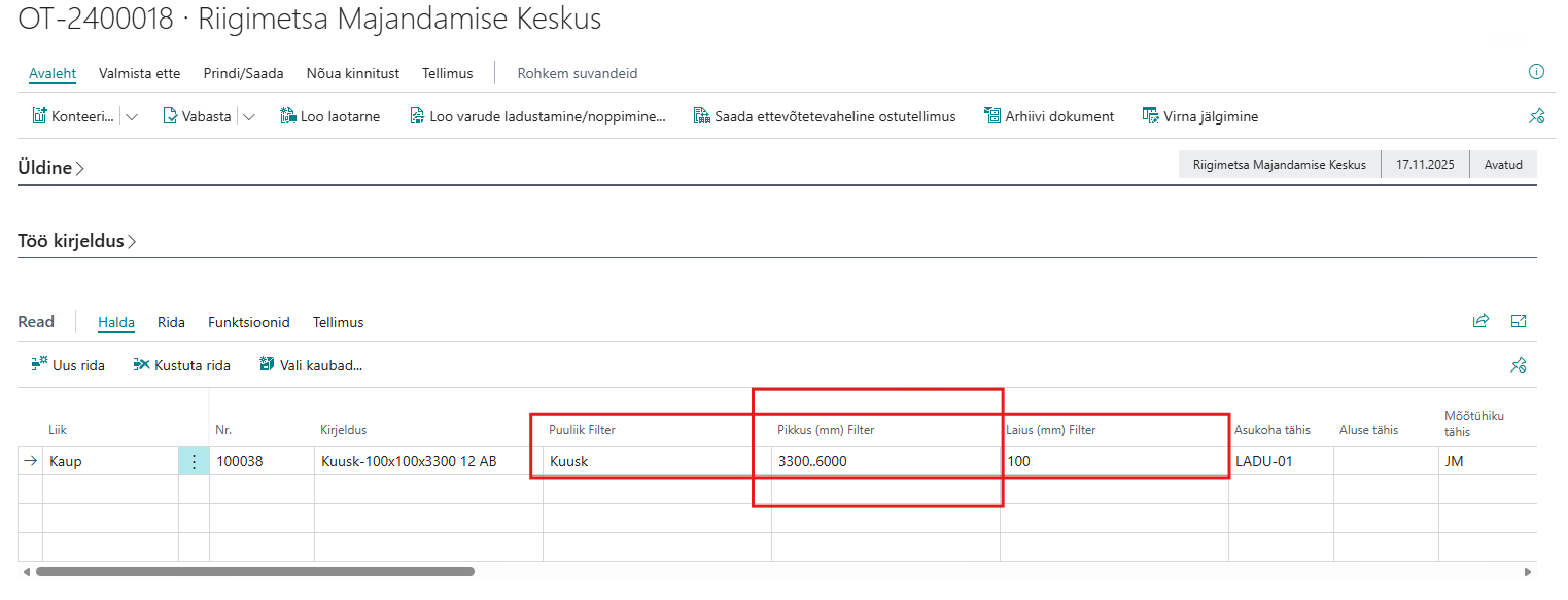 All näide atribuudi filtrite kasutusest ostutellimusel. Kõigile filtritele saab defineerida nii ühe kui ka mitu väärtust. Mitme valiku tarvis kasuta Business Centrali funktsionaalsuses olevat vahemiku ja eri väärtuste filtri määrangut, näitena toodud kauba pikkus vahemikuna.