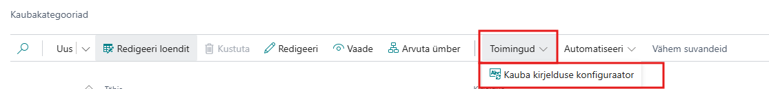 Eelseadistatud kauba nime konfiguraatori valemid saad luua igale kaubakategooriale. Selleks otsi Kaubakategooriad. Avanenud aknas märgi kursoriga kaubakategooria, millele soovid valemi kirjeldada. Seejärel vali Toimingud alt Kauba kirjelduse konfiguraator.