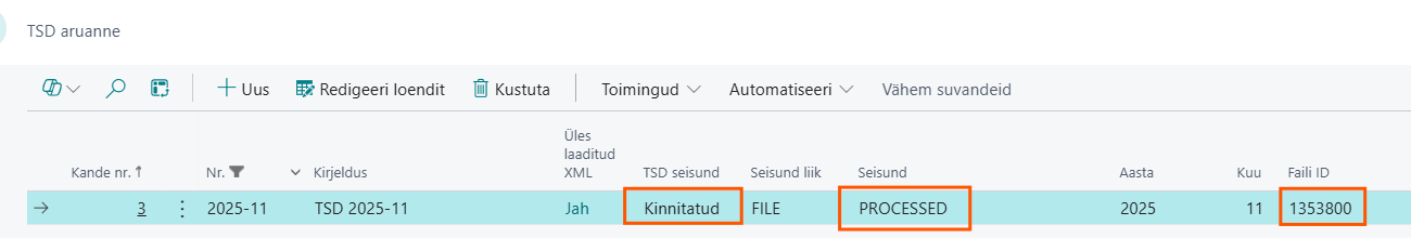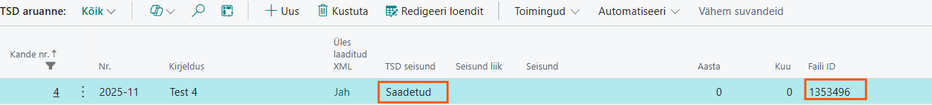 Vali lintmenüült Toimingud -> TSD faili edastamine. Kui fail on edastatud muutub TSD seisund "Saadetud" ja Faili ID veergu tekib maksuametist saadetud faili ID, mis on vajalik ka järgmiste päringute tegemiseks.