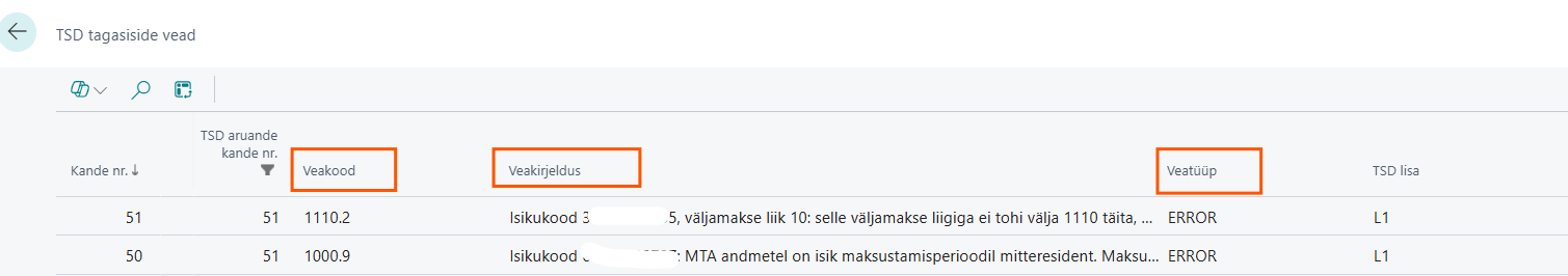 Klõpsates vigade arvul, avaneb tabel TSD tagasiside vead, kust näeb millisel TSD lisal, milliste isikute ridadega on probleeme. Veatüübid: