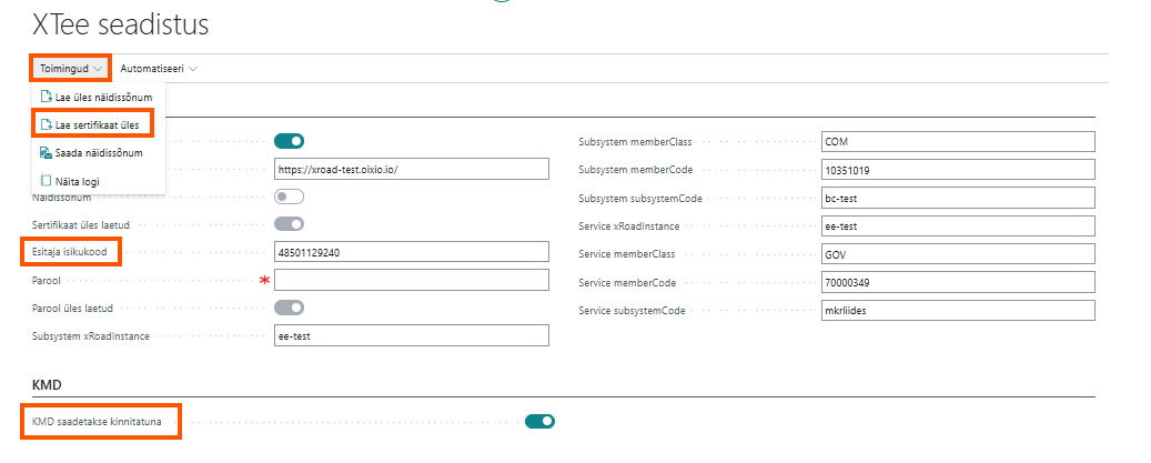 Lehel XTee seadistus saab üles laadida sertifikaadi: Toiminigud -> Lae sertifikaat üles. Sertifikaadi parool sisestada väljale Parool ja vajutada ENTER.