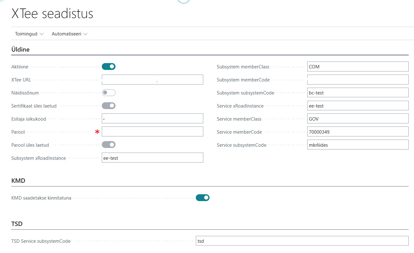 Seadistused tehakse lehel XTee seadistus. Deklaratsioonide edastamisega seotud seadistused tehakse paanil "Üldine". TSD'ga seotud lisaseadistused on paanil "TSD":